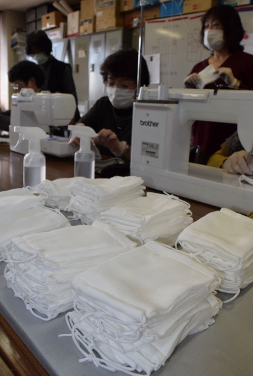 [写真/無償で配布される児童用の布マスクと作業するボ連協の会員ら ]