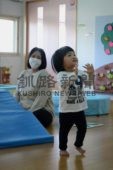[写真/壁掛け時計に興味を示し笑顔で手を振る佑真君とほほ笑む伊藤さん(東部センター) ]