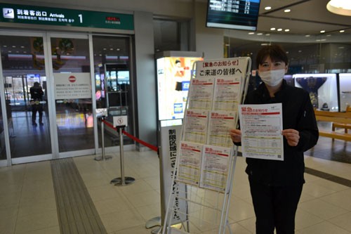 [写真/釧路空港では来道者向けに到着ゲートにチラシを設置し、新型コロナウイルスに注意を呼び掛けている ]