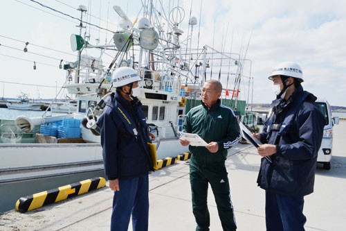 [写真/海難事故防止の重点を確認する漁船員と釧路海保職員 ]