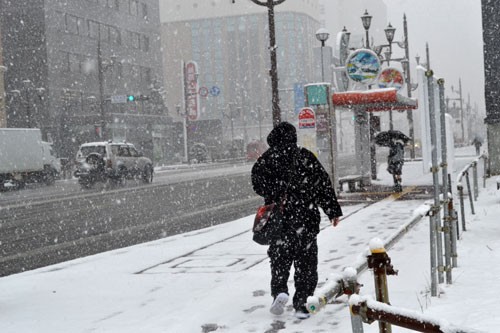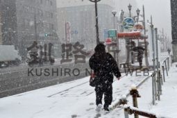 [写真/寒気が上空を通過した影響で釧路市中心部でもまとまった雪が降った(北大通7付近、9日午後2時ごろ) ]