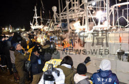 [写真/家族や漁協職員らの見送りを受けて沖を目指す小型サケ・マス漁船(10日午前0時、根室・歯舞漁港) ]