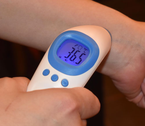 [写真/武田で導入された非接触型の体温計 ]