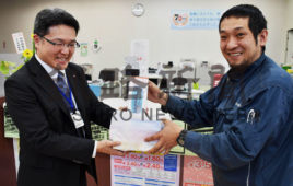 [写真/開設記念日に来店した右近燃料店の上村剛志社長(右)に記念品を贈る森支店長 ]