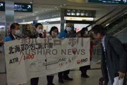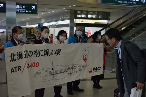 [写真/㊤初便の乗客を、横断目を掲げて到着ロビーで歓迎(12日午前11時50分ごろ)㊦22年ぶりとなる新機材ATR42―600型機。釧路空港に初号機が着陸(12日午前11時35分ごろ) ]