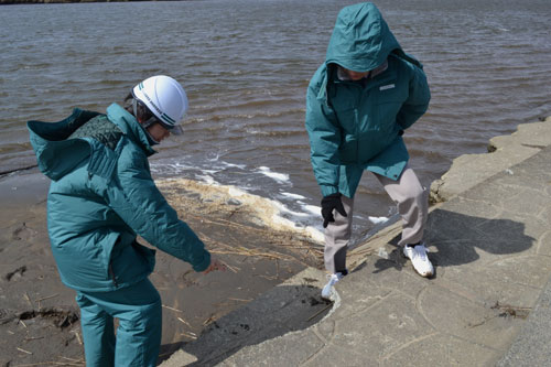 [写真/釧路川水辺の安全点検を行う釧路開発建設部の職員 ]
