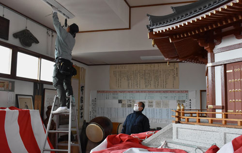 [写真/縮尺7分の1の法隆寺夢殿も設置されている職能資料館内での照明器具の交換 ]