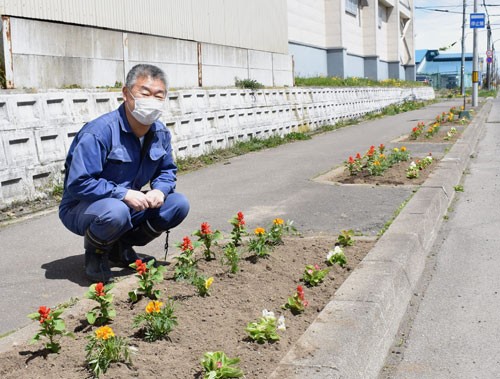 [写真/花の苗植えを終えた花壇の前で表会長 ]