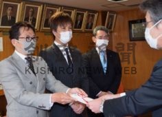 [写真/目録を手渡す坂入会長(左) ]
