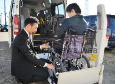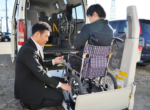 [写真/「車いす固定フックの正しい付け方とシートベルトの装着の仕方が大事」と説明する成瀬社長(左) ]