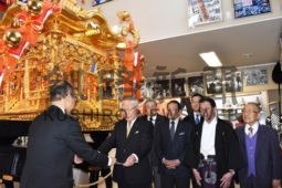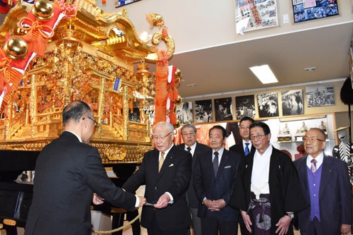 [写真/金刀比羅神社例大祭例大祭名物「大神輿」の横で証書が伝達された ]