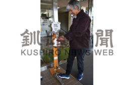 標茶の横井さん、足踏み式消毒液噴射装置製作、寄贈(2020-05-27)
