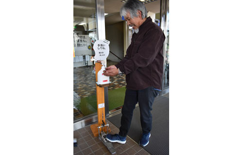 [写真/町役場の玄関で足踏み式の消毒を実演する横井さん ]