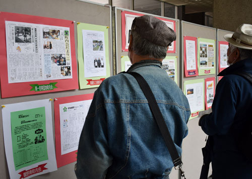 [写真/市役所1階ロビーに展示されている各町内会の広報紙 ]