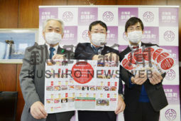 [写真/できあがったマップを手にする小松町長と金子部長、石原副部長(左から) ]