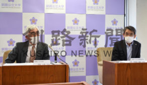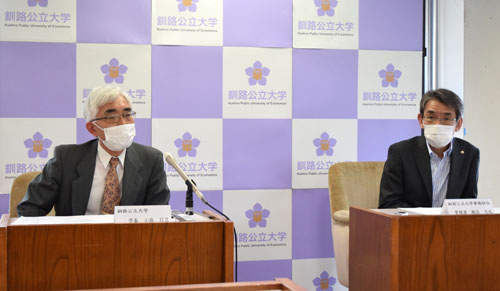 [写真/記者会見する蝦名市長(右)と小路学長 ]