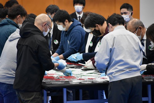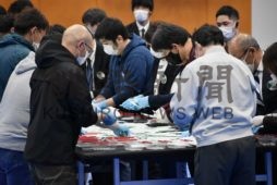 [写真/別海町長選の開票。新型コロナ対策としてマスクや手袋を着用し作業する町職員ら(24日午後9時ごろ、別海町民体育館) ]