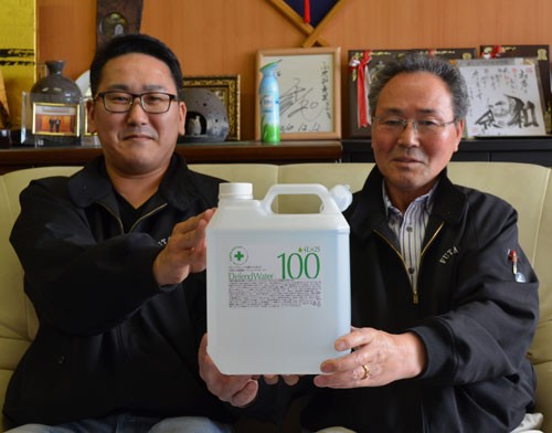 [写真/安心してさまざまな用途で使用できる除菌液と話す松本社長(右)と吉田本部長 ]