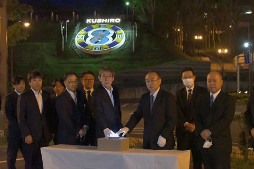 [写真/約5年ぶりに花時計上部に「KUSHIRO」の文字が光り輝いた ]