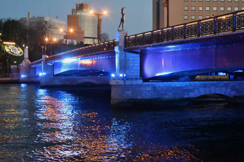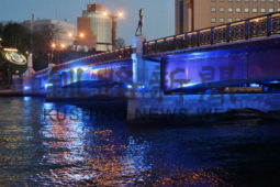 [写真/青色にライトアップされた幣舞橋(5月31日午後7時20分ごろ) ]