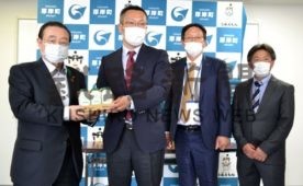 [写真/若狭町長にヨーグルトを寄贈する水谷会長と徳田組合長、佐藤副会長(左から) ]