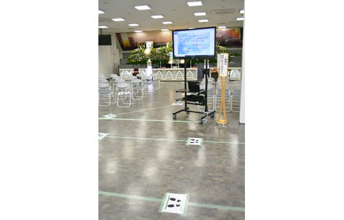 [写真/「3密」防止への協力を求める掲示板を設置している葬儀会場。他者との距離を確保しながら動線も整理(丸和堂) ]