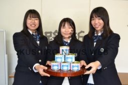 [写真/サンマ缶を手に「おいしく食べてほしい」と厚岸翔洋高の櫻庭さんと金子さん、茜さん(左から) ]