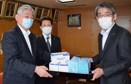 [写真/寄贈したマスクを手に天方会長、松井幹事、蝦名市長(左から) ]