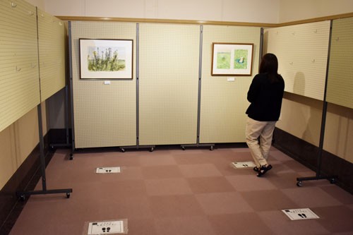 [写真/ソーシャルディスタンスの表記がある展示コーナー ]