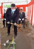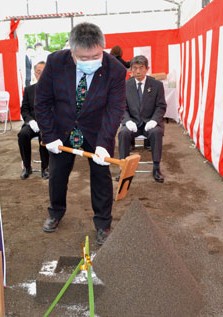 [写真/安全祈願祭でくわ入れする葭本理事長 ]