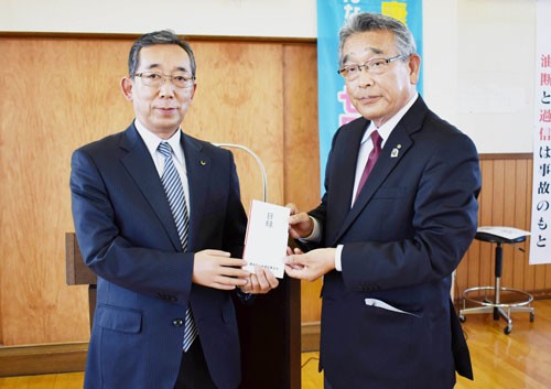 [写真/佐藤町長(左)に目録を手渡す尾崎会長 ]