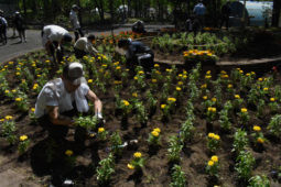 [写真/動物園の花壇整備を行う釧路ライオンズクラブの会員 ]