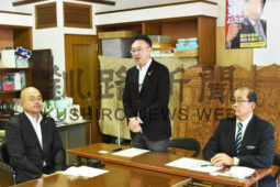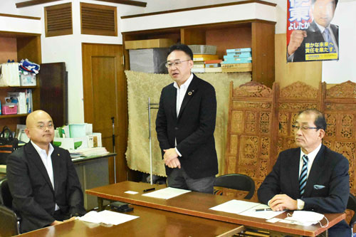 [写真/市長選の対応方針を説明する(左から)大澤事務局長、笠井支部長、島本幹事長 ]