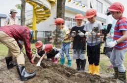 [写真/「大きくなーれ」と種芋を植える年長児 ]
