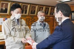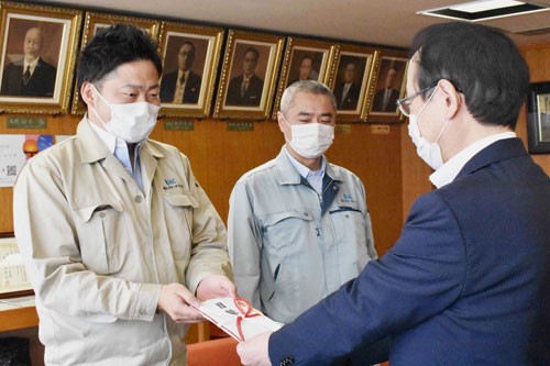 [写真/名塚副市長に目録を手渡す島本社長(左) ]