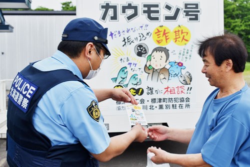 [写真/オリジナルの詐欺防止はがきを手渡し、注意を呼び掛ける齊藤巡査部長(左) ]
