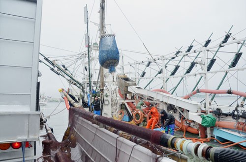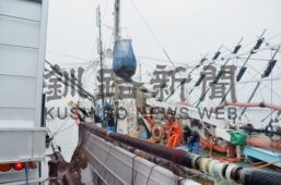 [写真/トラックへ直接積み込まれるイワシ(15日午前7時すぎ、釧路港) ]