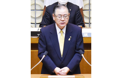 [写真/国の特別定額給付金事業を独自に拡充する方針を示す石垣市長 ]