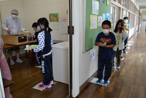 [写真/プレートの上に立ち給食の配膳を待つ児童 ]