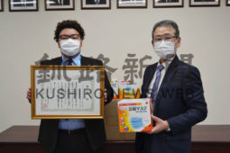 [写真/釧路市医師会に医療用マスクを寄贈するパーフェクトパートナーの熊谷部長(左) ]