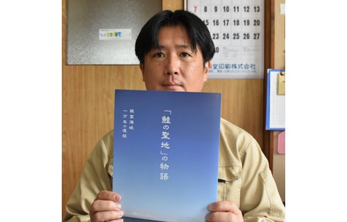 [写真/日本遺産に決まった「鮭の聖地の物語」のパンフレットを手にする小野学芸員 ]