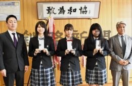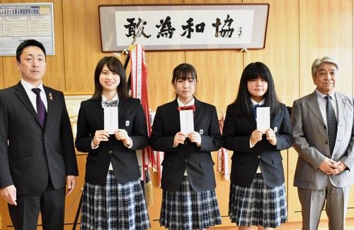 [写真/贈呈式で秋穂会長、八嶋さん、稲田さん、新免さん、富山幹事(左から) ]