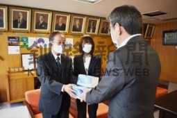 [写真/蝦名市長にマスクを寄贈する谷口支部長(左) ]