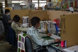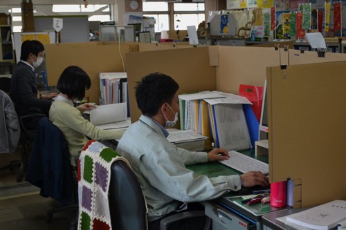[写真/高さも十分で飛沫感染対策に役立っている段ボールパーテーション(釧路市産業推進室) ]