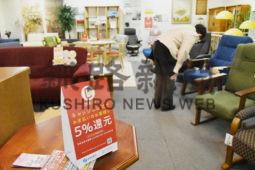 [写真/キャッシュレス還元制度を知らせるポップが置かれた店内(カタヤマホームセンター) ]