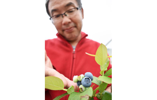 [写真/間もなく熟するブルーベリーと横田代表 ]