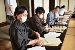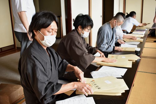 [写真/手際よく資料を入れた封筒に宛て名のシールを貼り付ける参加者たち ]
