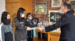 [写真/贈呈を受ける図書委員会の木村委員長(左から2人目)=美原小 ]