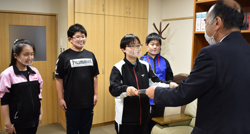 [写真/賞状を受ける児童生徒会の小杉会長(左から3人目)=山花小中 ]