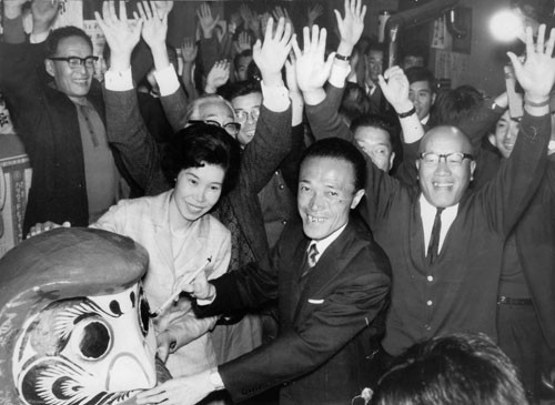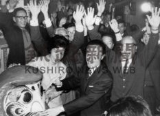 [写真/釧路市長の2期目当選に笑顔を見せる山口さん(中央)=1969年10月25日 ]